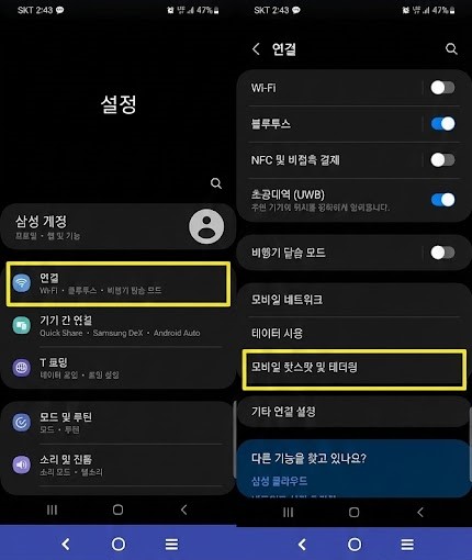 마지막으로 인터넷 연결을 공유하는 테더링 기능을 켭니다.