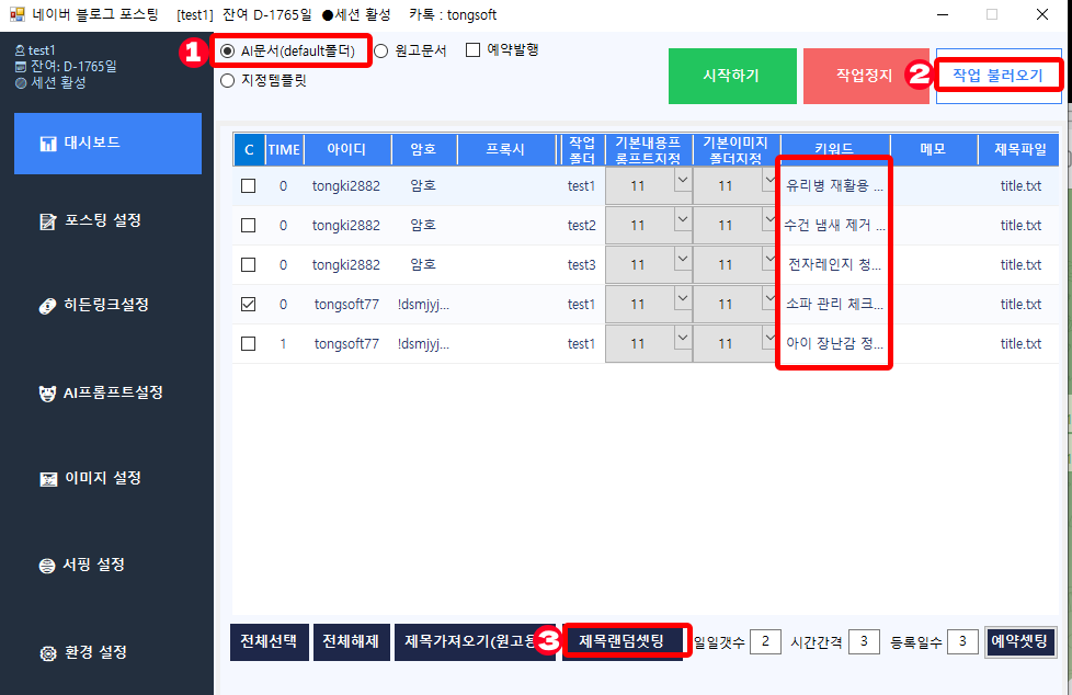 ③ [제목 랜덤 세팅] 버튼을 클릭하면 키워드가 자동으로 입력됩니다.