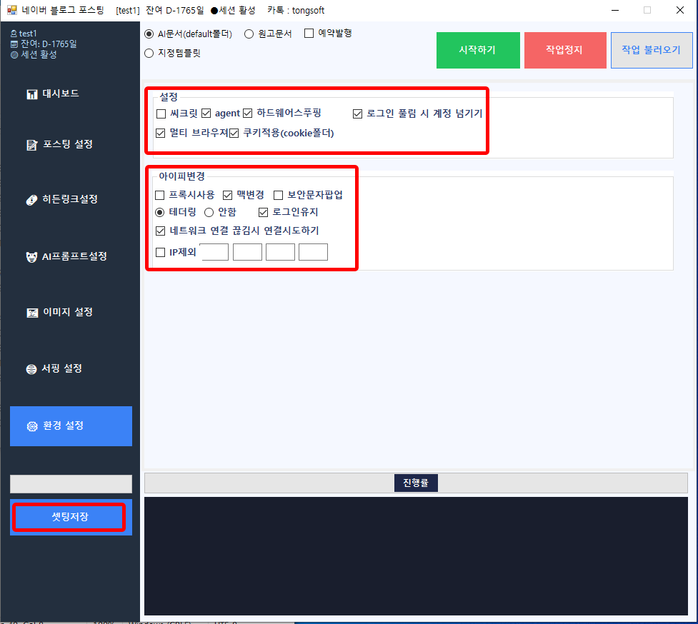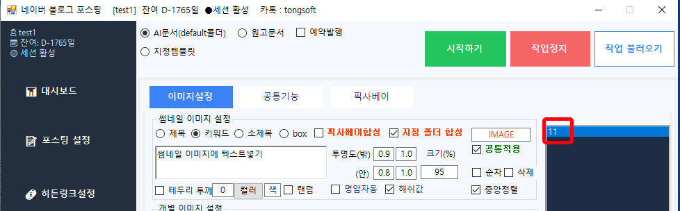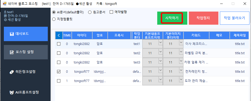 모든 설정이 올바르게 되었는지 확인하셨다면, [시작하기] 버튼을 클릭하여 자동 포스팅 작업을 실행합니다.