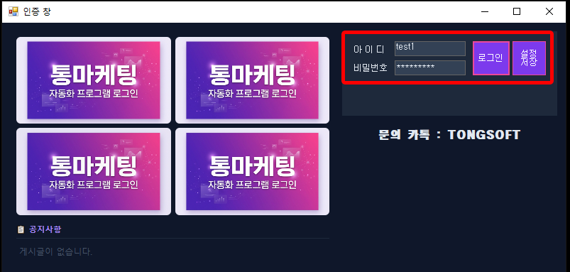 프로그램을 실행한 뒤 로그인합니다. 이때 사용하는 아이디와 비밀번호는 통마케팅 사이트의 로그인 정보와 동일합니다.