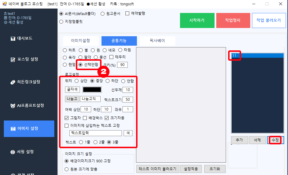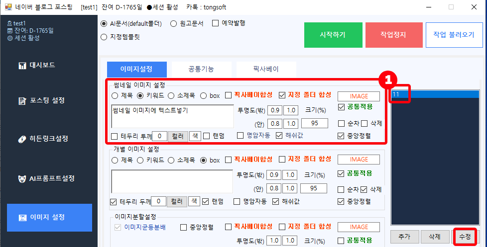 ① 이미지 설정: 옵션을 [ 11 ]로 맞춘 뒤, 가이드 이미지와 동일하게 세팅하고 [수정] 버튼을 눌러 저장합니다.