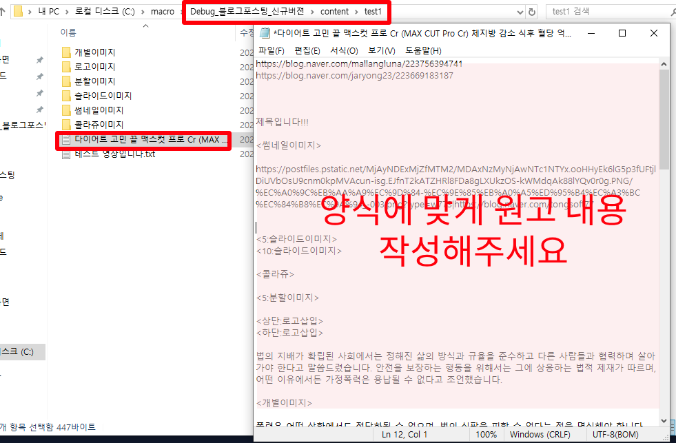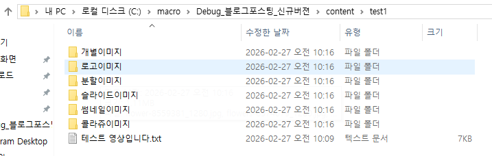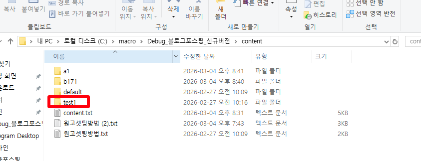 ② 작업 폴더 생성: C:\macro\Debug_블로그포스팅_신규버젼\content 경로 안에 이번 포스팅에 사용할 새 폴더를 하나 만들어 줍니다. (예: test1)