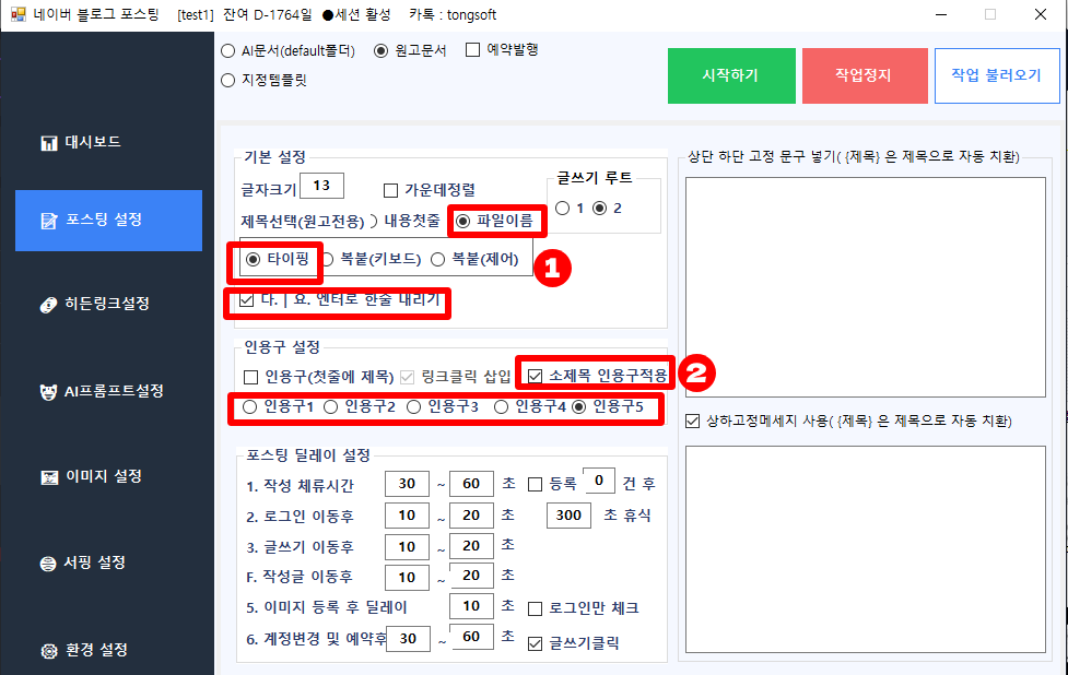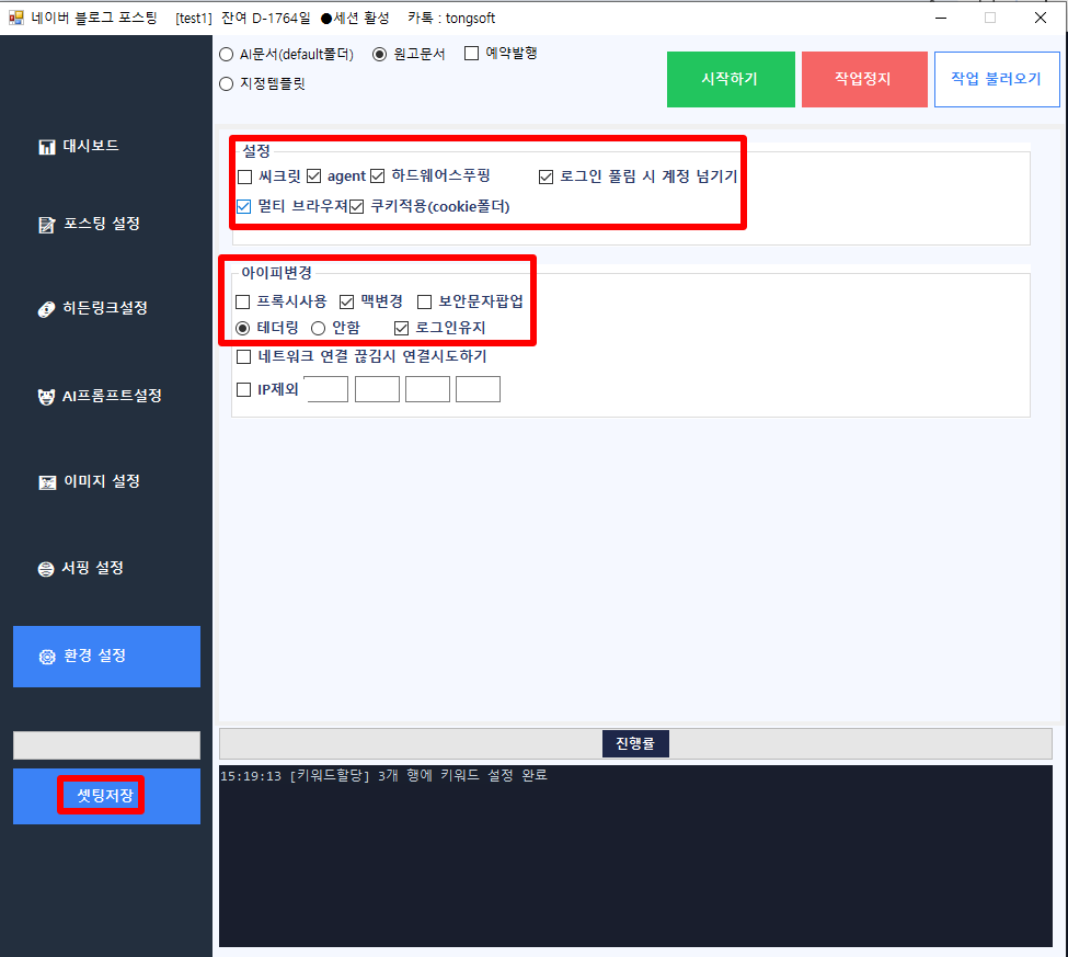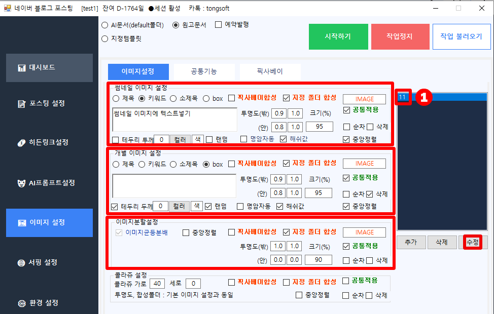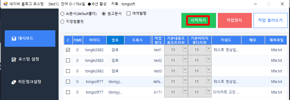 모든 설정이 올바르게 되었는지 확인하셨다면, [시작하기] 버튼을 클릭하여 자동 포스팅 작업을 실행합니다.