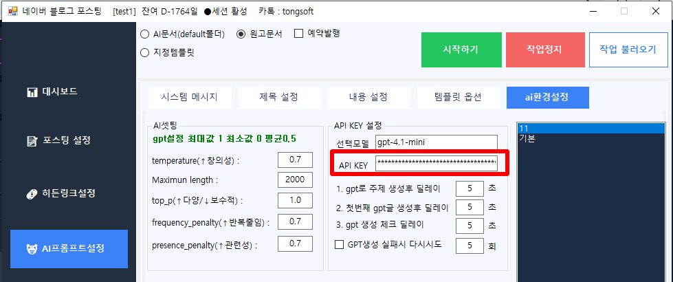 - [AI 환경설정]: 발급받은 AI API KEY를 입력합니다.