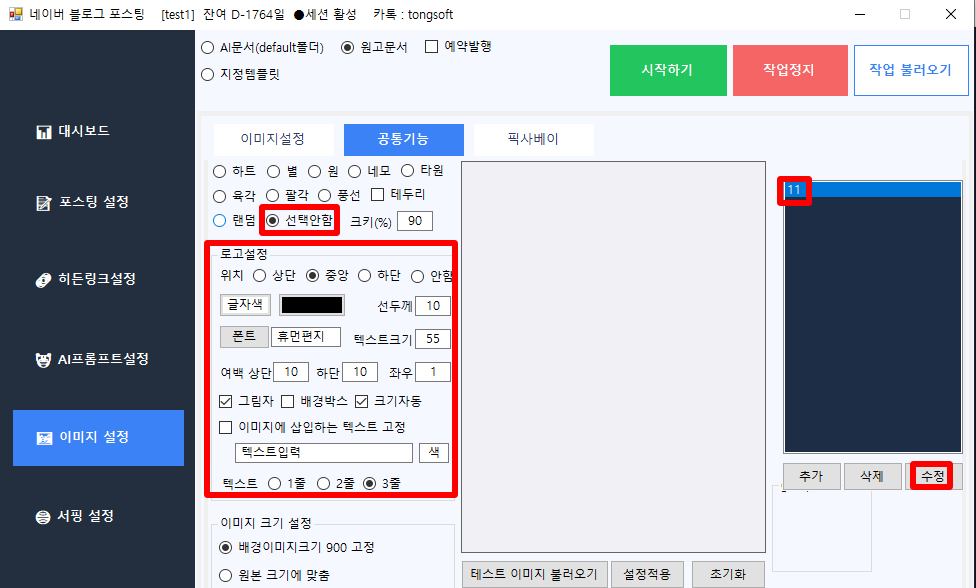 ① 이미지 설정: 옵션을 '11'로 선택하고, 가이드 이미지와 동일하게 세팅 후 [수정]을 눌러 저장합니다.